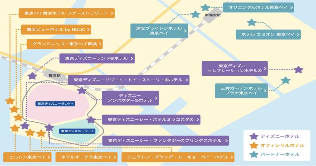 | オフィシャルホテル | ディズニー公認。無料シャトルバスあり。 | 東京ベイ舞浜ホテル、シェラトン・グランデ・トーキョーベイなど |