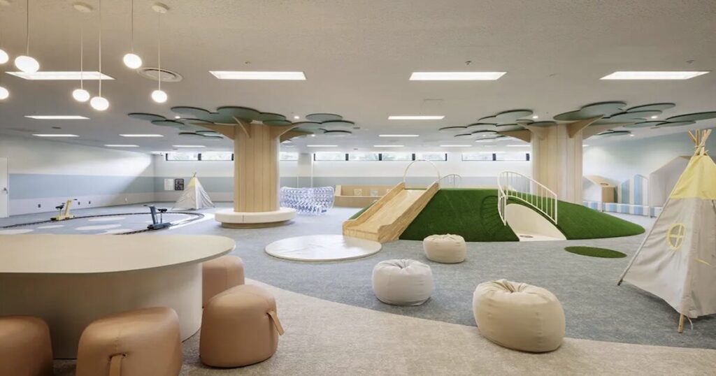 木のぬくもりを感じる【あそびば】は、安心・安全なキッズスペース。滑り台や休憩スペースなど、親子で快適に過ごせるナチュラルな空間です。