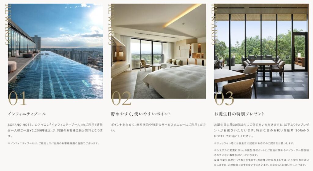 また、ソラノホテルには入会金・年会費無料のメンバーシッププログラム「SORANOロイヤリティプログラム」があります。